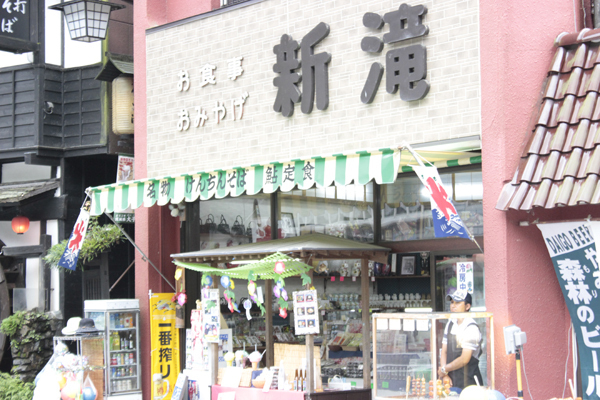 袋田の滝,仲見世通りの『新滝』は、観瀑台まで歩いて約5分!店先には特産品や串団子並び、一見お土産屋さんにしか見えませんが、店内奥にはお食事のできるゆったりしたスペースがございます。「奥久慈しゃもそば」、「寿定食」は地元の食材をふんだんに使用した人気の高いメニューです。オススメの手作り団子は米粉を練り上げ自家製味噌をたっぷりと! 大人から小さなお子様まで、ぜひお気軽にお立ち寄りください。