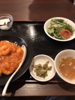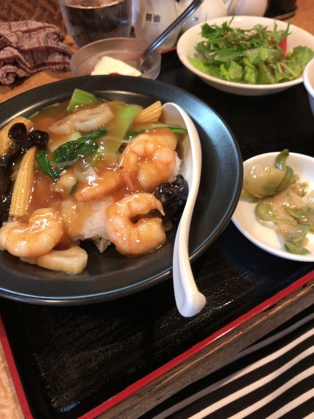 日曜のランチに行きました。着席してすぐに満席になりました。いただいたのは海老あんかけ丼。サラダ・スープ・ザーサイ・ミニ杏仁豆腐が付いて¥1,190!あんがご飯に絡んでもっちり!海老もプリプリでした。辛いのがお好きな方は麻婆豆腐や黒担々麺も旨辛でおススメです。