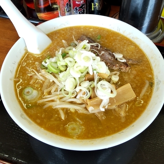 ●みそらーめん820円 スープはとんこつとニンニクのインパクトがある味噌スープ。 麺は中太麺のかため。少し違和感あり。 トッピングはホロホロチャーシュー、ねぎ、もやし、メンマなど。
