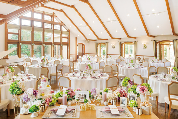 プライベートガーデンとパティオに面した大きな窓から自然光が入る明るいパーティー会場