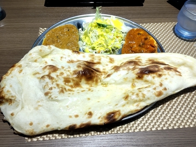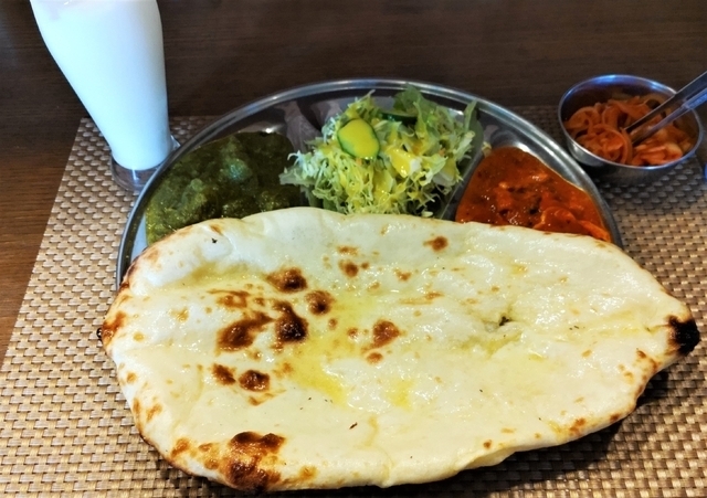 《Bランチ》¥770(税込) 本日のカレー2種類、チーズナン(+¥55)、ソフトドリンク(ラッシー)をいただきました。 本日のカレーは何種類かある中で、バターチキンとサグレチキンを選びました。 ルーの量は多くありませんが、結構チキンが入っていました。 チーズナンに変更する場合プラス55円で、他のお店に比べるとだいぶ安いです。 その分チーズの量は少なく、チーズが伸びるような感じはあまりありません。 でも、おいしくいただきました。