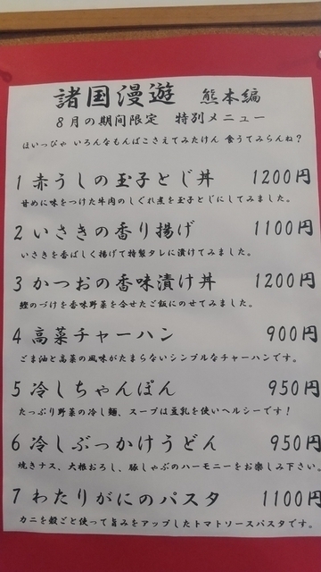 諸国漫遊と称して、月ごとに各地のご当地メニューが頂けるお店。壁には過去の限定メニューが張ってあって、どれも食してみたいメニューばかり。私は熊本編の冷やしちゃんぽん頂きました。野菜たっぷり、豆乳スープでヘルシーでした。
