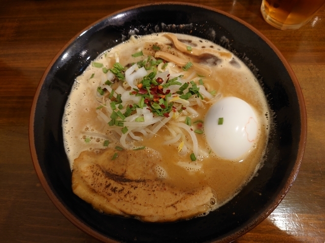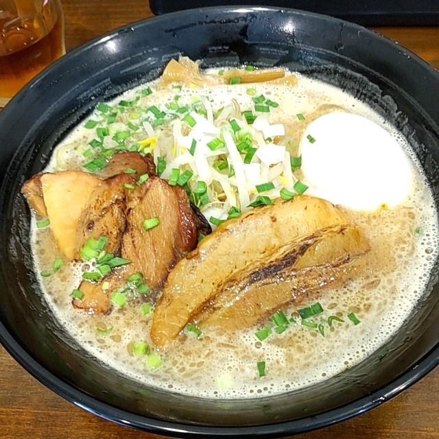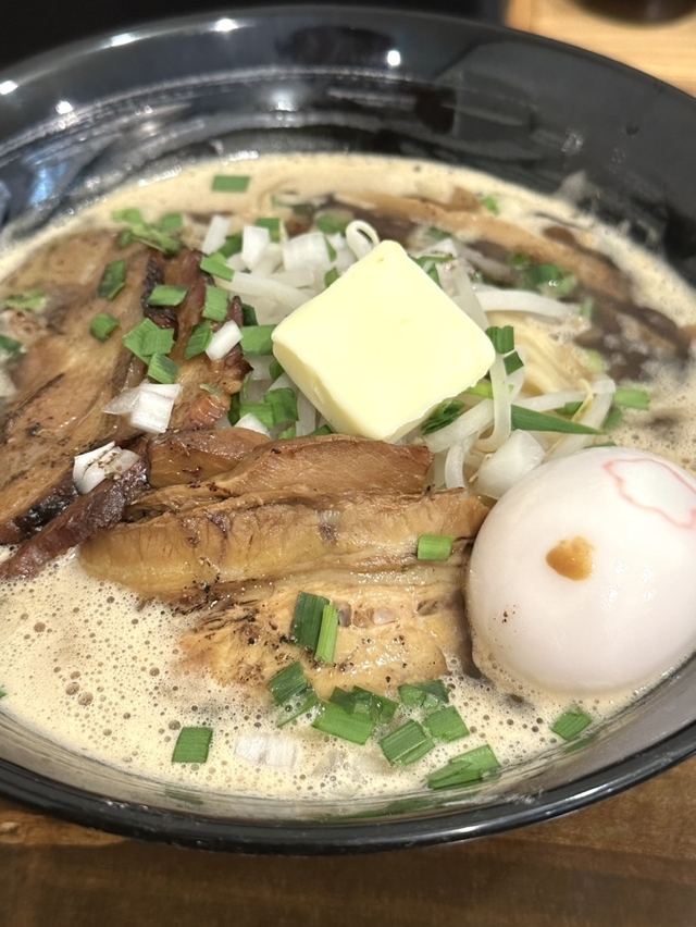 トッピングは煮豚焼豚2枚ずつ、桜玉、もやし、ネギ、メンマ、追加のバター。 豚はどちらも味濃くホロホロで美味しい。 桜玉は出汁打ち込み式ですかね。濃厚です。