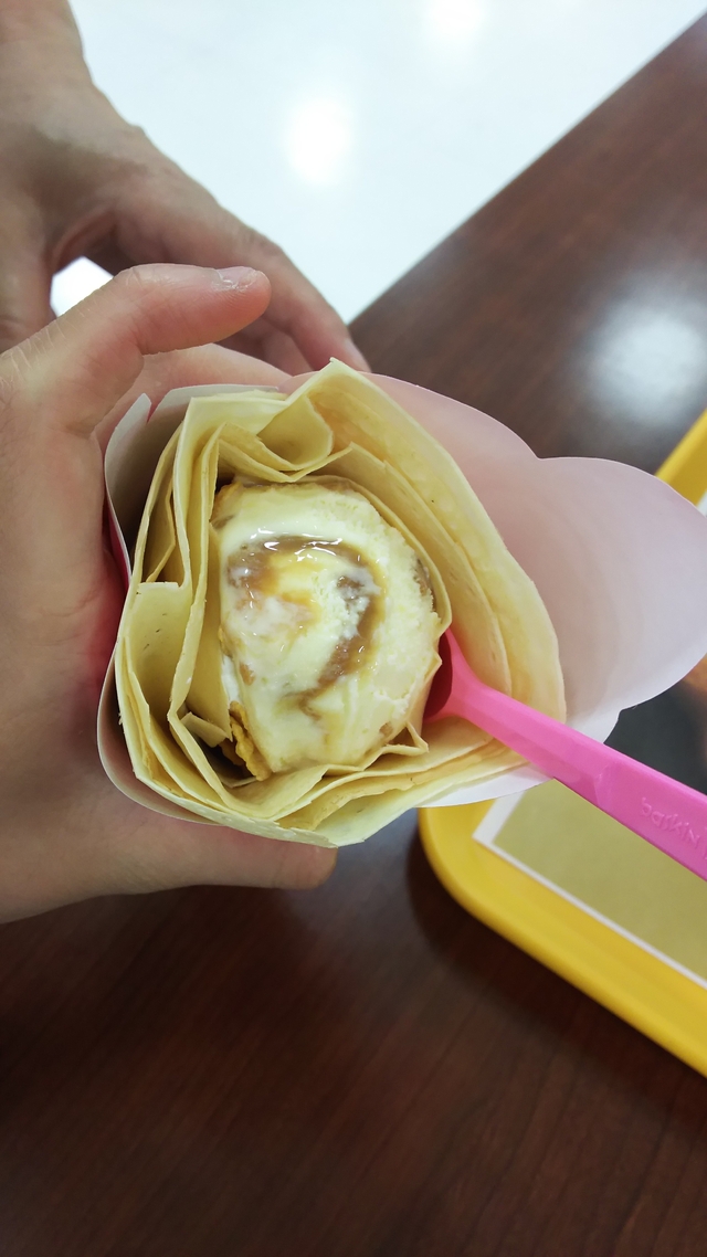 また出掛けた時に食べに行きました!キャラメルクランチ?今の時期限定のアイスでクレープにしました(*´ω`*) 皮が焼きたてで温かくて美味しかったです!