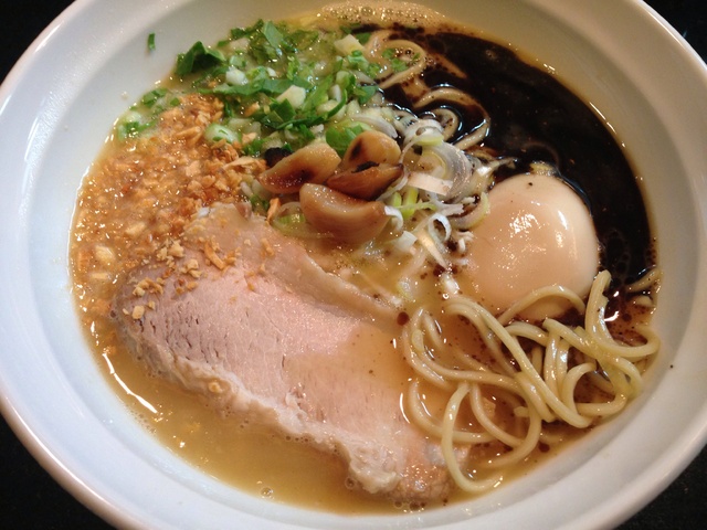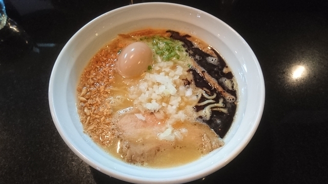 開店してすぐの訪問。鶏そば、担々鶏そば、そして表記メニューの3種。修業店の人気メニュー、鶏そばのDNAを受け継ぐ濃厚鶏白湯に、マー油、フライドガーリック、焼きニンニクを乗せたメニューは、ニンニク好きにはたまらない。順次新メニューがアップされているようなので再訪が楽しみだ。