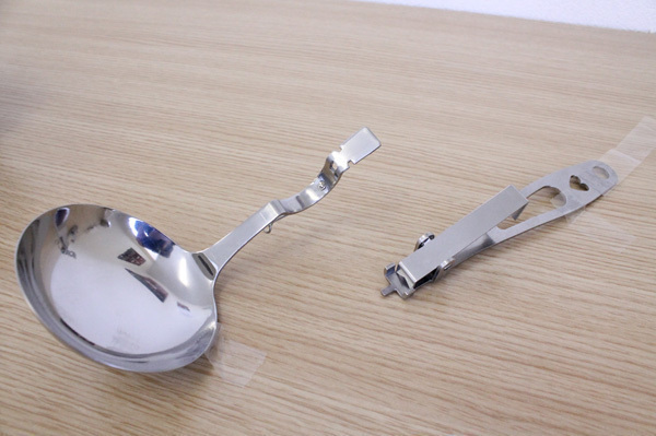 写真の、取っ手が外れるお玉「とれ玉」は、ワンタッチで取っ手が外れて鍋に掛けて置けるのでお玉置き不要。そのままフタも出来てとっても便利!お求めはヤフーショッピング、または鹿嶋市の「ソーシャルホーム」にて。