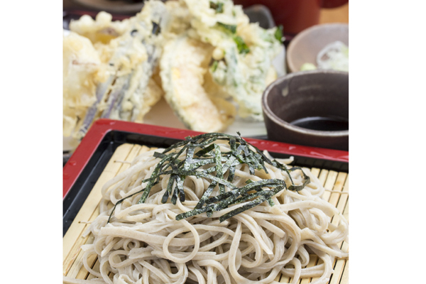 そばは毎日施設内の石臼で挽きたてのそば粉を使用。手打ちしてお出ししております。