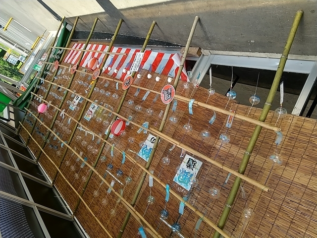 夏になると風鈴を飾って耳にも目にも涼しい。今年は風鈴を買おうと思ったら、風鈴は売り物ではありませんでした。 お土産品というより、地場野菜などが多い感じでした。お菓子や飲み物も売っているし食堂もあるので休憩にも良いです。
