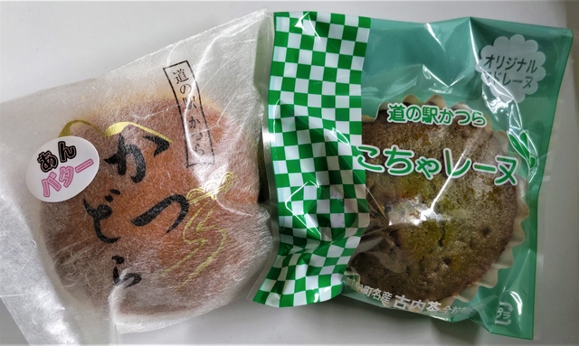 《こちゃレーヌ&かつどら》 道の駅かつらでおすすめのお菓子です。 こちゃレーヌは、地元特産の古内茶の粉末を使って焼き上げたマドレーヌで、お茶の風味を味わうことができます。茨城新聞で紹介されていました。1つ170円。 かつどらは、どら焼きで5種類ありました。 あんバター、小倉、白あん、栗、いちごです。結構な大きさのどら焼きです。 購入したあんバターは1つ220円。 5種類のミニどら焼きがパッケージされた商品もありました。