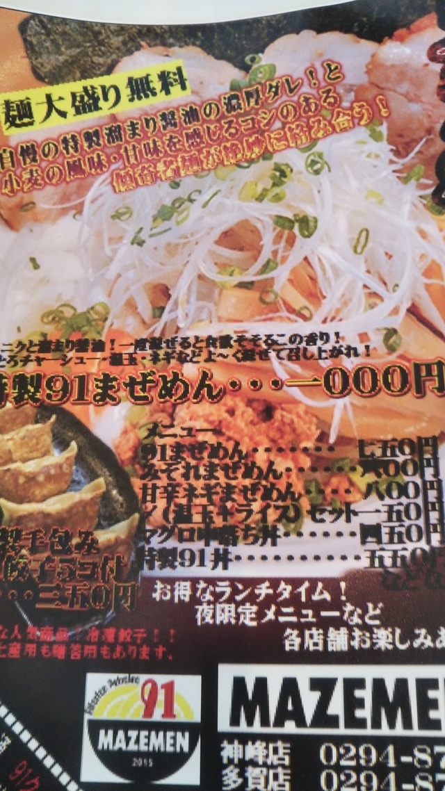 カルパッチョ風と悩んで91まぜめんにしました。 一口食べた印象は味噌っぽい味がした気がします。そしてチャーシューがマジウマ! けど、カウンターに張ってある通りにお酢とラー油をひとまわし。あ、なんかいい感じ! そしてかつお粉とマヨネーズを入れると一気にマイルドに!! 個人的にこの形態が一番好きかも。 ずっとその携帯で食べてるとどんどん口のなかがくどくなってくる。 そこでスープを投入。 さっぱりと最後まで食べられました。 満腹満腹。 お冷やの水差し?にはレモンの輪切りがはいっていて優しさが感じられました。