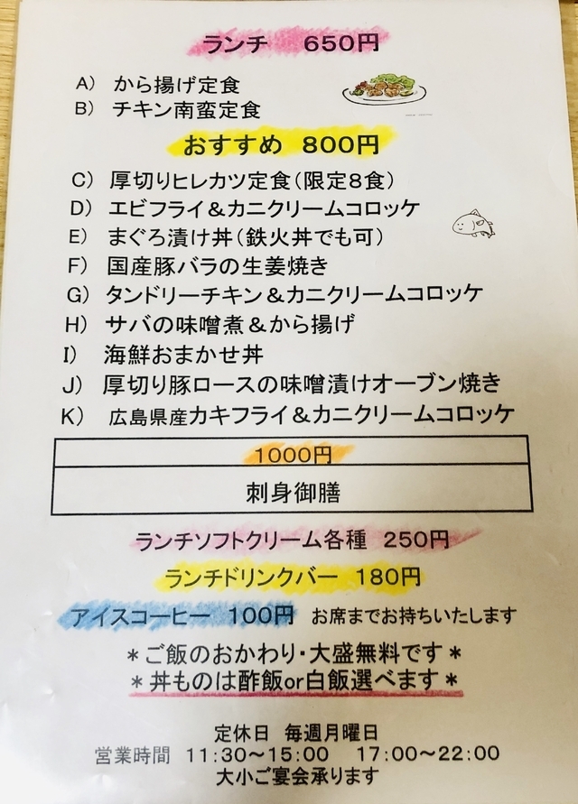 平日ランチに訪問しました。 入店すると先ず店員さんから喫煙の有無を聞かれ、禁煙席の掘りごたつお座敷席へ案内して頂きました。 海鮮おまかせ丼のご飯大盛(無料)と、単品のチキン香味ソース、おにぎり(おかか)を頂きました。 メニュー全体的にお安い印象です。 また利用したいです。 ご馳走さまでした。