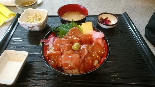 2020.11.26(木)11:50訪問。 先客二組、後客 本日のランチは、古河市内旧総和町のエリアのこちらで。 10種類近くあるランチの中から、まぐろ漬け丼800円をオーダー。 こちらのお店、650円ランチが二種類、800円のランチが九種類あるようです。 待つこと7~8分、着丼。 厚焼き玉子が2切れ、ワカメ、海草、ガリに漬けまぐろは10切れちょい。 卓上に醤油がありましたが、その醤油が必要ないくらいしっかりと漬けてあります。 その他、お麩のお味噌汁、マカロニの小鉢、しば漬けが付いてきました。 ごちそうさまでした。