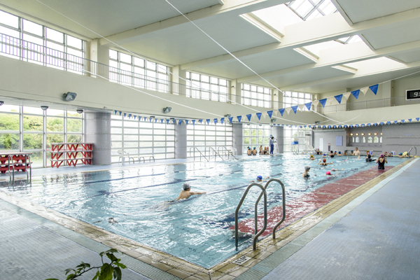 太陽がふりそそぐ開放的なプールは25m×4コースの温水プール。