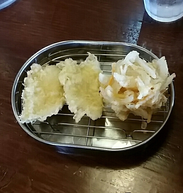 ◆とり天定食869円 とり天3毎、かき揚げ、ピーマン。 揚げたてを時間差で提供です。 カラッと揚がり、 味もそこそこで、 メニューも豊富なので、 お昼には最適です。