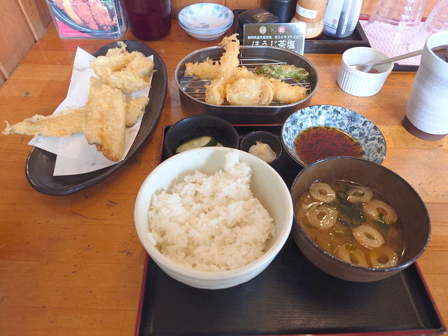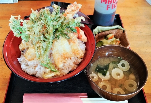 【得徳天丼】 天丼が食べたくて訪問しました。天丼は2種類。 今回いただいたのは、えび天、白身魚天、野菜天5品がのった得徳天丼。 野菜は、春菊、舞茸、さつまいも、ねぎ、にんじんでした。 揚げたてでとてもおいしくいただきました。(980円) 自分でご飯のおかわりができる、うれしいサービスがあります。 もう1種類の天丼は、白身魚天の代わりに穴子の一本揚げがのった「てんの天丼」です。(1,250円)