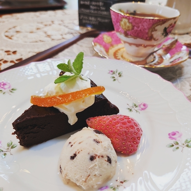 本日2度目 シフォンケーキが食べたくて 14頃お邪魔しました 残念ながら シフォンケーキはなかったので、 ガトーショコラを注文 でも、正解だったぁ✨ 生チョコのような滑らかさ、甘くなく大人な味 付け合わせのアイスもイチゴもオレンジピール?も全てが美味しかったです