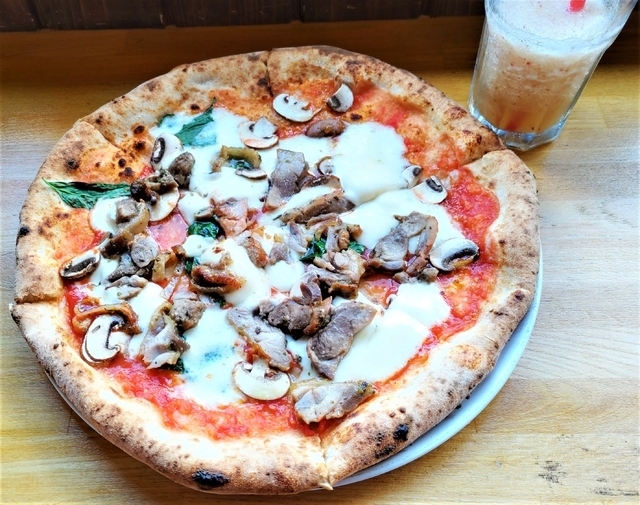 《ハーブチキンピザ(奥久慈しゃも使用)》1,950円(税別) マルゲリータなどの基本のピザのほか、地元食材を使ったピザもあります。 今回は奥久慈しゃもをハーブで香り付けして焼いたものをトッピングしたピザをいただきました。 直径およそ30cmのピザで、食べ応えありました。 女性1人では、完食は難しいかも知れません。(残した場合はお持ち帰りできます。) こんにゃく入りのりんごのスムージーもいただきました。(400円税別) こんにゃく感はほとんど感じませんが、おいしかったです。