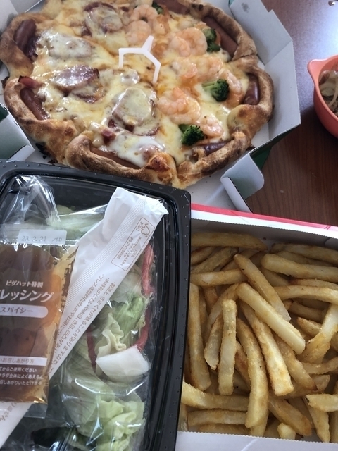 ピザとポテト、サラダを購入。生地を選べて便利です。今回はソーセージ入りの食べ応えがあるハーフハーフにしました。トッピングは各種プラスマイナスできてお気に入りです。