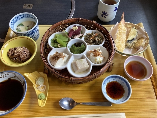 以前は4-10月のふぐ料理と冬場のアンコウ料理で知られた割烹「ふじ田」が店変わりしたこちら。多くの路地がある住宅街内という立地のため、なかなか場所がわかりにくいです。平日昼に連れと初訪問しました。店前と店脇の駐車場はほぼ満車という盛況です。店内に入っても少々待機させられ、ようやく掘り炬燵(4人掛け)の小個室へ案内されました。両隣の個室から談笑の声が結構響きます。ポットでたっぷりの熱いほうじ茶が到来したのは良いです。ランチメニューから籠膳「凜」を白米or十割蕎麦のところ、蕎麦で注文しました。本日の蕎麦は北海道音威子府産のキタワセ種だとか。混んでいるからか30分超でようやく配膳。平膳の上には籠に入った七連皿、赤米おこわ(胡麻塩がけ)の小鉢、茶碗蒸し(カニカマボコ/シメジ/銀杏/三ツ葉/柚子)、蕎麦つけ汁の小鉢、刺身醤油の小皿と薬味(刻みネギ/ワサビ)皿が載っています。七連皿には刺身(マグロ赤身・中トロ/サーモン/鯛)、切り干し大根(ニンジン・エノキ・油揚げ入り)、菊花と菜の煮浸し、めかぶの酢の物、胡麻豆腐の湯葉載せ、真ん中の皿にはきな粉と抹茶・黒蜜をかけたわらび餅。次いで到来したのは、揚げたて熱々の天ぷら籠(海老天/エノキ天/ナス天)と紅葉おろしを落とした天つゆ皿。最後に十割蕎麦を盛った箱ざると蕎麦湯桶。七連皿の盛合せはちょっと贅沢な感じでかつ美味しい。十割蕎麦は天ぷらとともに味わい、これも美味しいです。茶碗蒸しはとろとろの仕上がりが良いです。蕎麦湯は結構白濁でとろみあり、蕎麦つけ汁を割って完食完飲となりました。なお玄関付近には訪れた著名人の色紙も飾られていました。