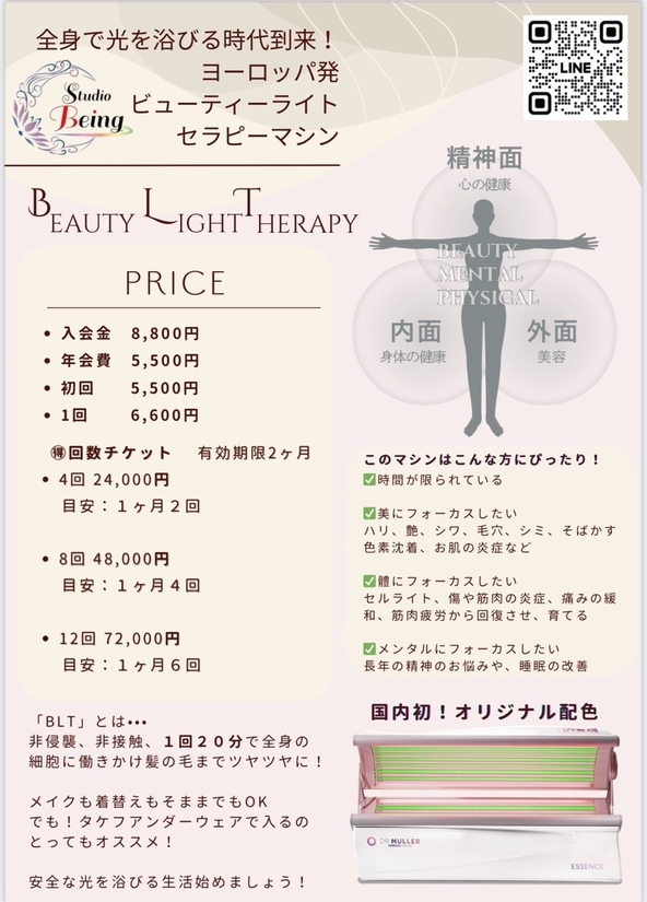 【BLTとは…】 非侵襲、非接触、一回20分で全身の細胞に働きかけ髪の毛までツヤツヤに! メイクも着替えもそのままでOK! でも、タケフアンダーウェアで入るのでとってもおすすめ♪ 安全な光を浴びる生活を始めましょう! ■入会金 8,800円 ■年会費 5,500円 ■初回 5,500円 ■一回 6,600円 お得な回数チケットも販売しております♪ こんな人にぴったり! ・時間が限られている ・ハリ、艶、シワ、毛穴、シミ、そばかす、色素沈着、お肌の炎症 ・セルライト、傷や筋肉の炎症、痛みの緩和、筋肉疲労から回復させ、育てる ・長年の精神のお悩みや、睡眠の改善