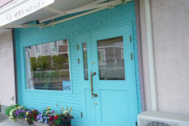 塙山小学校そばの交差点にある「焼菓子nanan」。かわいらしい小鳥の看板と、水色の壁が目印です。