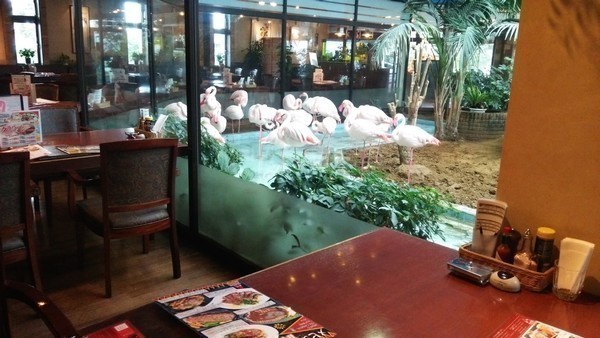 本物のフラミンゴを眺めながら名物カニピラフをお楽しみください。