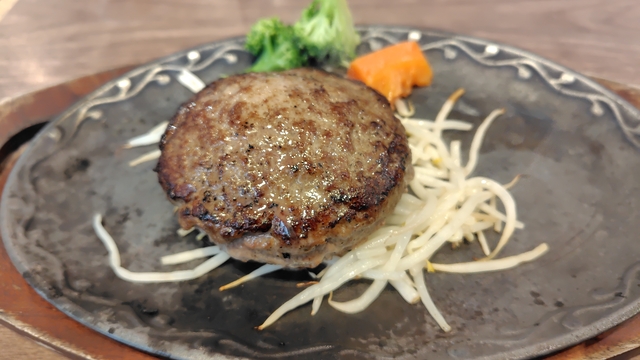 ハンバーグを食べました。 鉄板が熱々なので肉汁が飛んでくるので紙エプロン必須です。 サラダバーもお腹いっぱい食べて大満足でした。 また行きます。