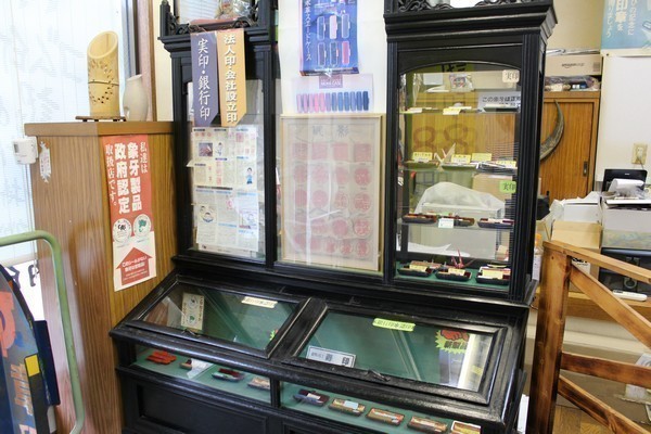 初代(大正時代)から受け継がれた味のあるレトロな雰囲気のショーケースには、手彫りの伝統と風格を感じさせる様々な印鑑を揃えております。是非、気に入ったものをご用命ください。お客様のイメージを大切にまごころを込めてお仕上げ致します。