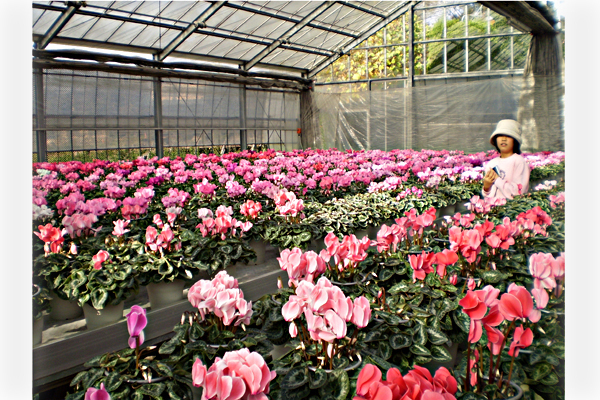 手灌水でひとつひとつの鉢に水をかけ、愛情こめて育てています。その為、根ぐされをおこしづらく、5月位まで長持ちするとリピーターに評判です。