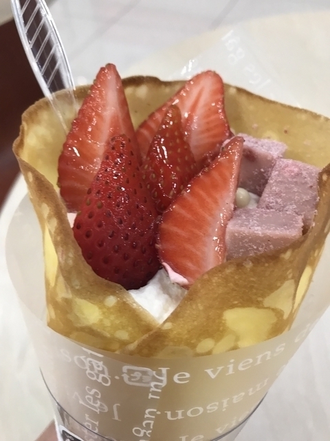 初めてクレープを購入してみました。中にはスポンジケーキが入っているのでクレープというよりはショートケーキを食べているかのよう!これで290円は最高にお得です。2人でシェアしても食べ応え十分でした。