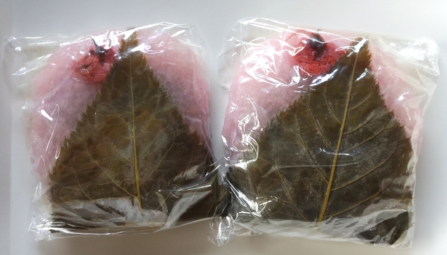 【桜餅】 このお店の桜餅は、道明寺桜餅を薄くした感じになっていて、中には粒あんが入っています。 もち米を使っているので、モチモチとした食感で、ほどよい甘さの餡がおいしかったです。