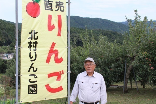 農園の中の大きな看板が目印です。りんごの栽培は北村さんのライフワーク♪丹精込めてお作りしています!