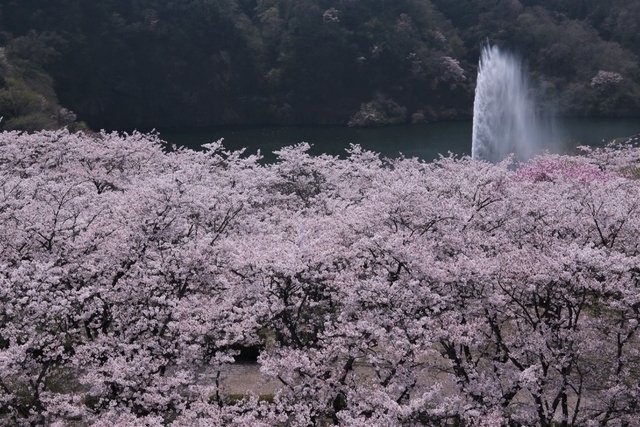 春は桜が満開になります。UFO型展望台からは十王ダムの大噴水(10時、12時、14時、16時の1日4回、1回あたり約5分間)と桜のコラボレーションを見ることができます。