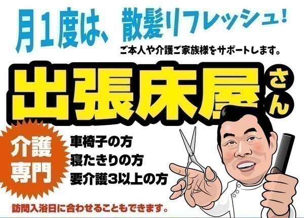 また出張・送迎カットも行っています。車椅子、介護用のイスに座りながら、寝たきりの状態でのカットが可能。ご予約の際は介護カットとお申し付けください!※雨の日は要相談