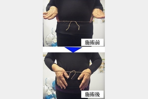 マッサージではありません。触れる程度の感じでリンパを流していきます。 施術前と後の写真です。 指だけしか入らなかったのに、手がスッポリ入るまでウエストダウンしました!