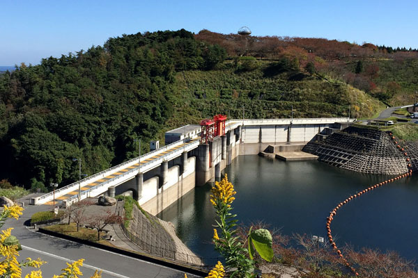 ダムから5km東に向かうと海に達し、堤体に立てば太平洋を望むことができる「海が見えるダム」です。