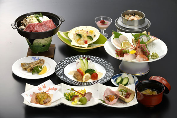 宿泊者限定の「夕定食Aコース」(5103円)。季節の食材と、新鮮な海の幸をお楽しみいただけます。