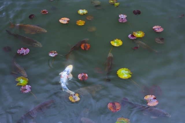 国民宿舎鵜の岬の館外にあるスイレン池。 夏になると池一面に見事な睡蓮の花が咲きますが、今の時期は、スイレンの新芽がでてきたところです。 ここの鯉は人馴れしているのか、池岸に立つと近づいてきて餌をねだっているように感じます。