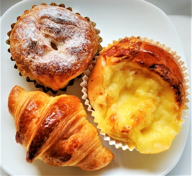 菓子パンが、いろいろ並ぶ中から、クロワッサン、かぼちゃ餡デニッシュ、チーズパンの3つを購入しました。 どのパンも150円~160円と良心的な価格で、おいしかったです。 HPによると、看板商品は「食パン」だそうです。