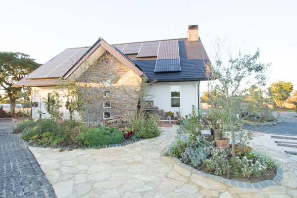 煙突が当店の目印♪建物周りはタイルが敷き詰められており、草花が季節を彩ります。