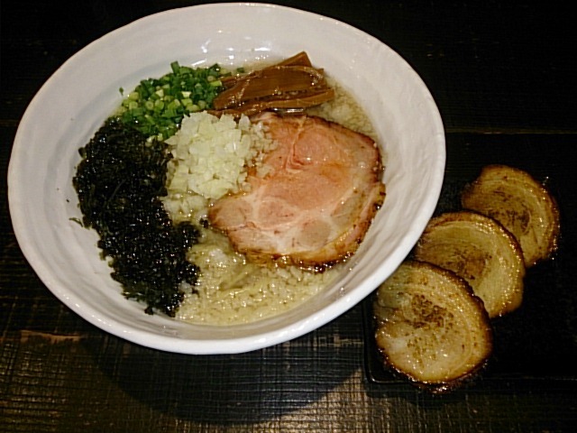 本日の限定メニュー!! 見ため黒い醤油は円みのあるしょっぱスープで角がない。煮干しの旨味も出ており背脂もぃぃ感じで蕩けプラスα-p-p 平打ち手揉み麺も適度に絡んで一体感があった。 別トッピ叉焼は旨いが仕込み仕様で冷たいタイプだったのが残念です(--;)