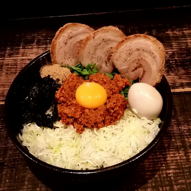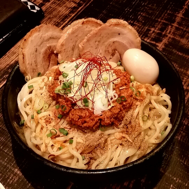 ⚫特製台湾まぜそば1,000円 ちょっと辛口の台湾まぜそば。 ネギなどの野菜が多いのが特徴。 大きなチャーシューや、味玉も美味しい。