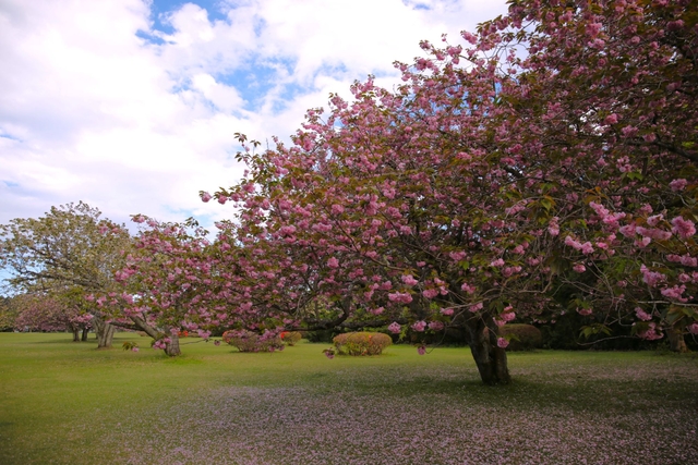 八重桜が満開を過ぎて、だいぶ花びらが地面に落ちている時期に行ってきました。 ソメイヨシノが咲く桜まつりの頃の混雑と違って、犬の散歩の方をチラホラと見かけるだけの静かな公園で、のんびりと散策を楽しんできました。