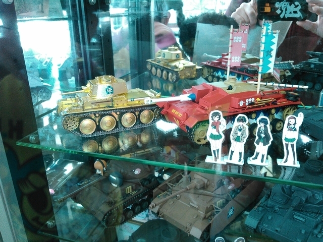 中に入るとプラモがショーケースの中にズラリ。 ガルパンの物がほとんどなのでしょうか?詳しくないので分からないのですがけっこうな数ありますね。 コンビニの方もジュースやお菓子、カップラーメンの他にとんかつなんかのお惣菜も 販売しています。少しですが軍物のグッズも販売してましたね。