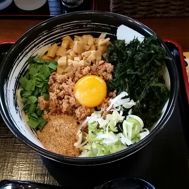 今大人気の台湾まぜそばを食べに。 魚粉、玉子、ネギなどを麺に混ぜて食べます。 仕上げは追い飯を混ぜていただきました。