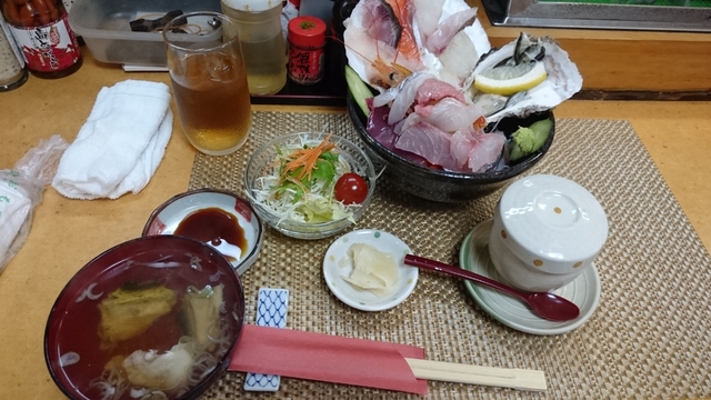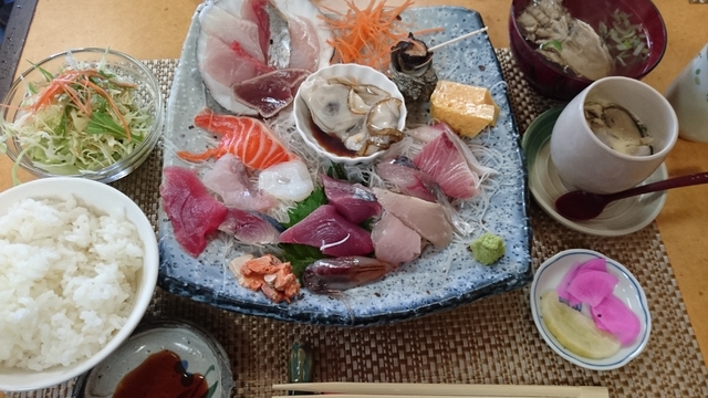 お客さんがいっぱいで、並んで待ちました。人気店なんですね! 定食にはお刺身が付くということで、ミックスフライ定食を注文。分厚い白身魚のフライや、カキフライも大ぶりでびっくり!とても美味しかったです。