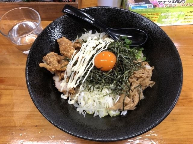 日曜日正午に行きました。2つの座敷は満席だったのでカウンターへ。以前から気になっていたまぜそば¥950を初めて注文しました。麺量普通、トッピングも無し。オーション麺が濃厚タレによく絡んでとても美味しかったのですが、焼豚ではなく唐揚げだったのが少し残念でした。熱々の唐揚げは美味しかったのですが、唐揚げは単品で食べたい。こちらの炙り焼豚が好きなので、まぜそばのトッピングも炙り焼豚だったら嬉しかったです。