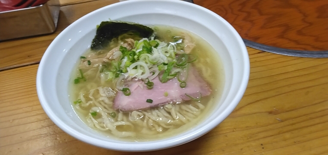 初訪問です。 食券機でラーメン(塩)をポチり。 具はチャーシュー、メンマ、板海苔。 スープはアッサリ、ネギが多めでクドくなくサッパリと食べられます。