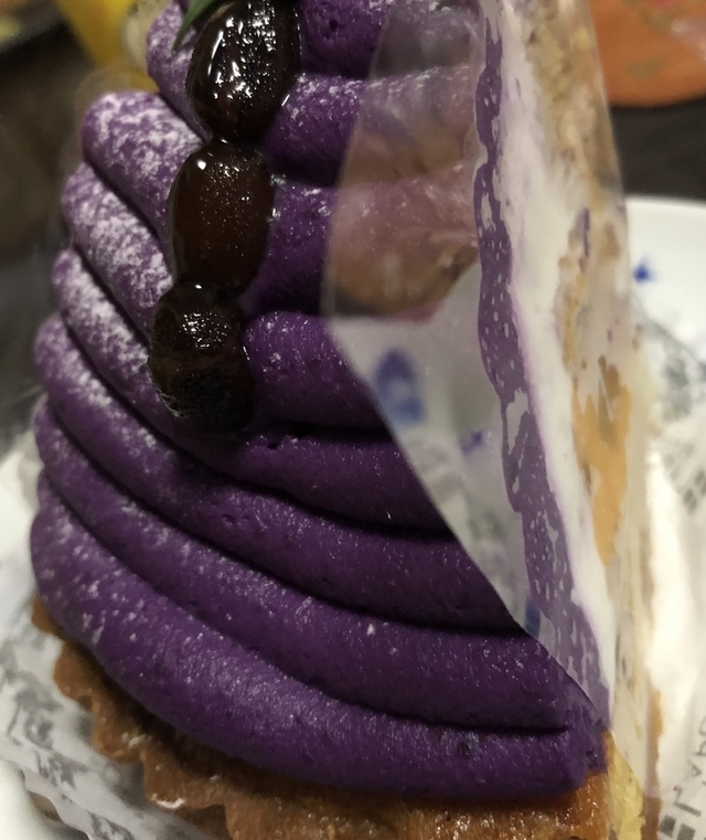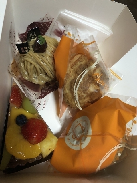 結婚記念日にケーキとシュークリームを買いました。ケーキは紅芋タルト。濃厚なクリームが美味しい!シュークリームはいつ食べても食べ応えがありますね。