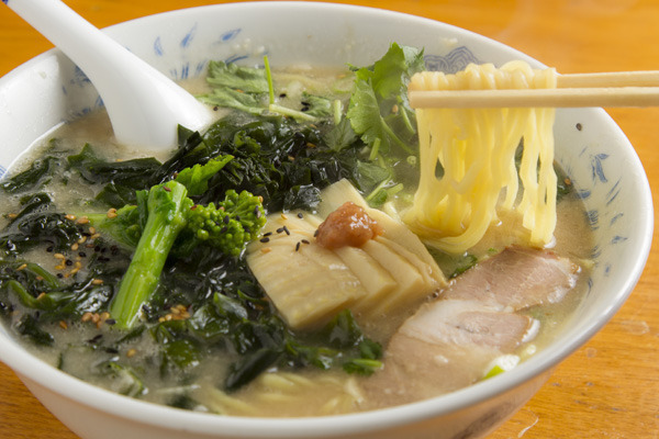 「春限定」若筍ラーメン。新筍とワカメ、三つ葉に菜の花をトッピングした春の香りあふれる一杯